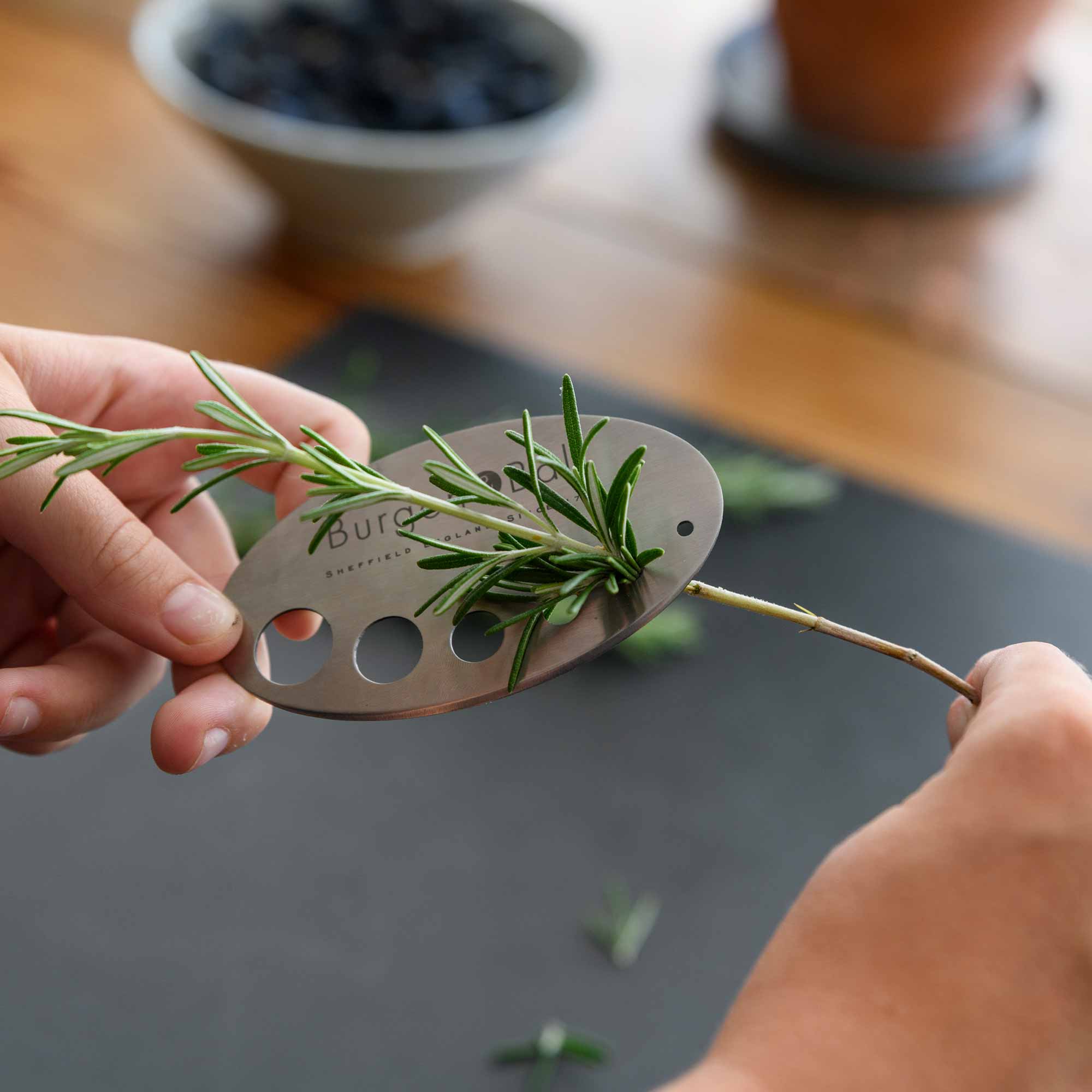 Mit dem praktischen Kräuter-Stripper lassen sich viele frische, duftende Kräuterblätter ganz einfach ernten. Schneiden Sie einfach einen Stengel von Ihrerem Küchenkraut ab und stecken Sie das Ende des Stiels durch das Loch in der passenden Größe. Einfach durchziehen, schon sind die Blätter vom Stiel getrennt und gebrauchsfertig für die Küche.