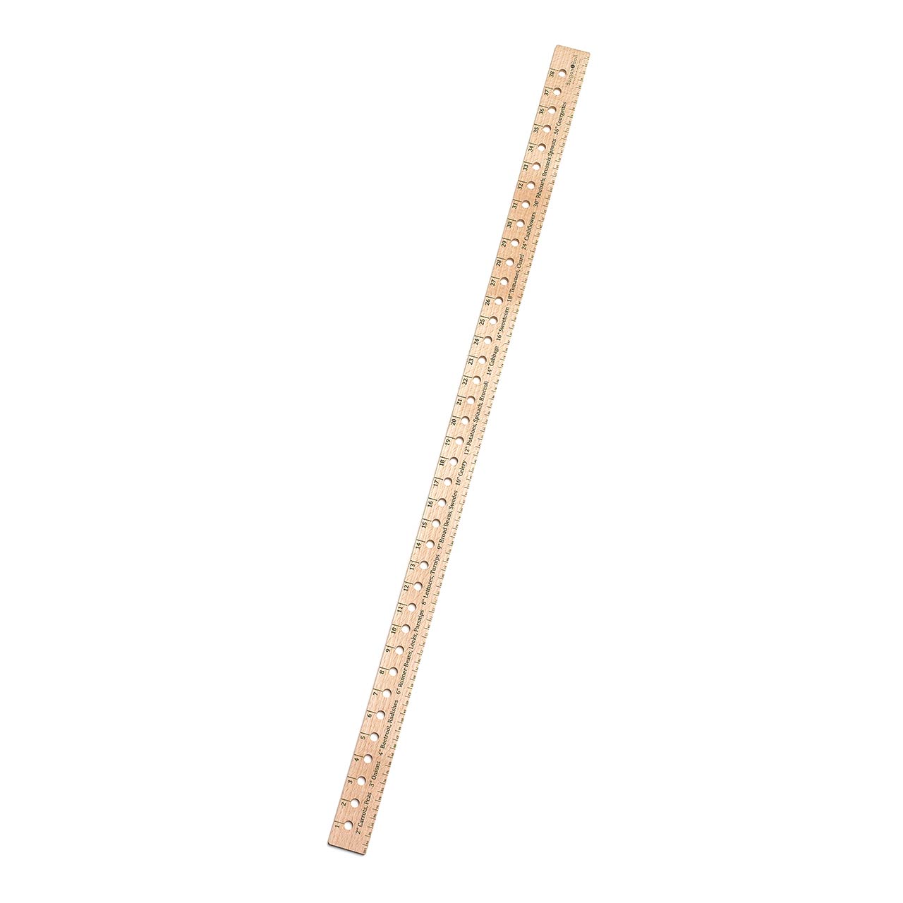 Die Angaben zum Pflanzabstand für die gängigsten Gemüsesorten sind auf das Lineal aufgedruckt: Karotten, Erbsen, Rote Beete, Radieschen, Stangenbohnen, Lauch, Pastinake, Kopfsalat, Rüben, Ackerbohne, Kohlrüben, Sellerie, Kartoffeln, Spinat, Brokkoli, Kohl, Zuckermais, Tomaten, Mangold, Blumenkohl, Rhabarber, Rosenkohl, Zucchini.