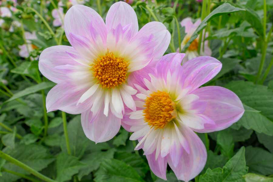 Dahlien sind auch ausgezeichnete Schnittblumen und haben eine lange Lebensdauer in der Vase. Die beste Zeit zum Schneiden von Dahlien ist früh am Morgen. Legen Sie die Stiele sofort in lauwarmes Wasser mit Schnittblumennahrung.