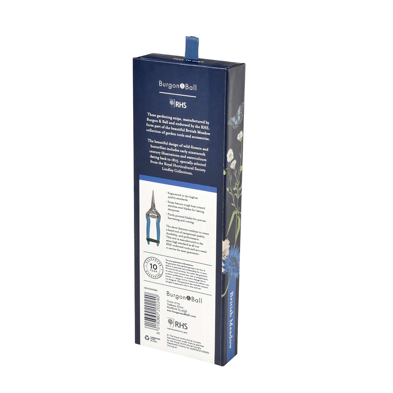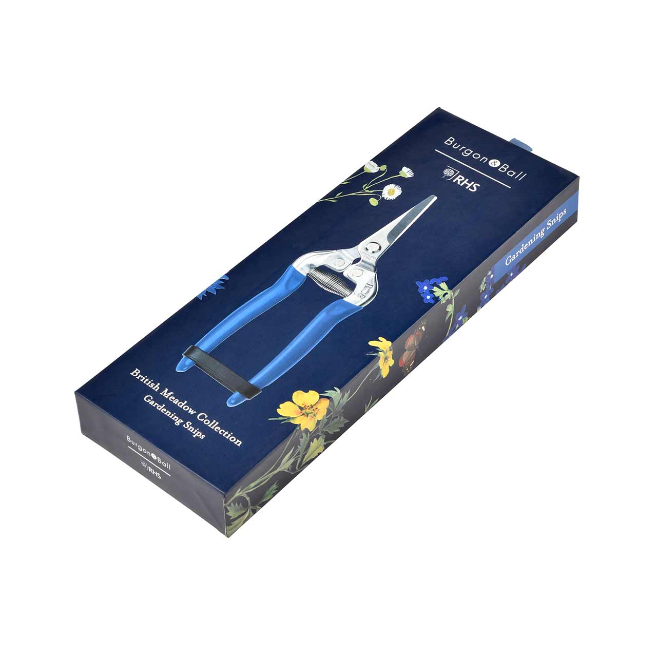 Die Gartenschere wird von der Royal Horticultural Society empfohlen. Die leichten Griffe aus Aluminium und die Klinge aus gehärtetem, rostfreiem Carbonstahl sorgen für eine lange Lebensdauer. Die Klinge hat eine zehnjährige Garantie und verfügt über marineblaue Griffe, die das British Meadow-Muster ergänzen. Die hübsche Geschenkbox ist plastikfrei und vollständig recycelbar.