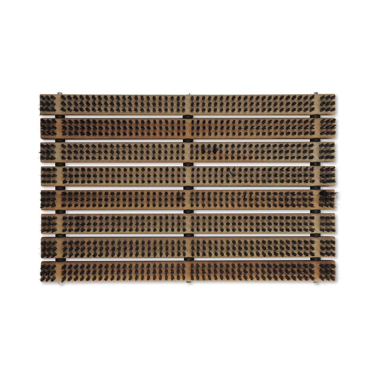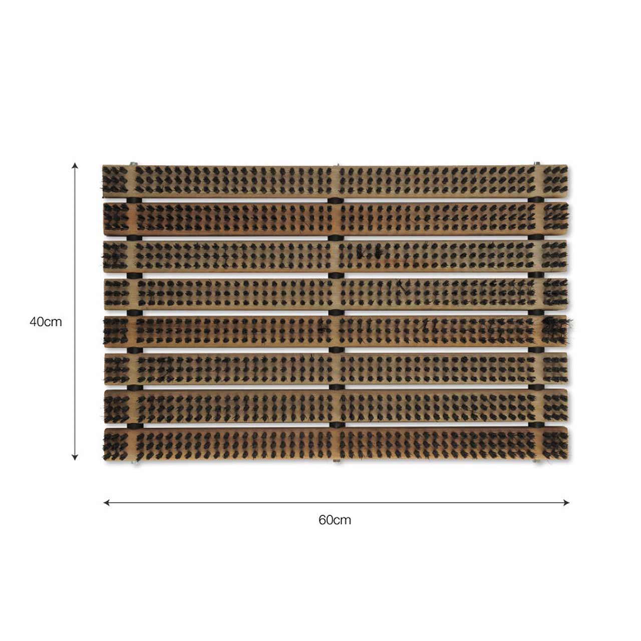 Der Fußabtreter hat einen robusten Lattenrost aus Buchenholz. Die großen Borsten sind ideal um Schmutz von Gummistiefeln und Schuhen zu entfernen.