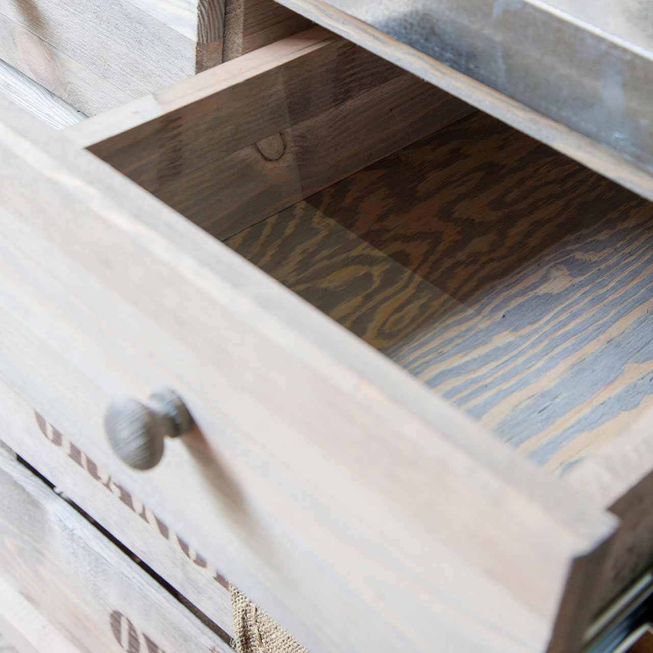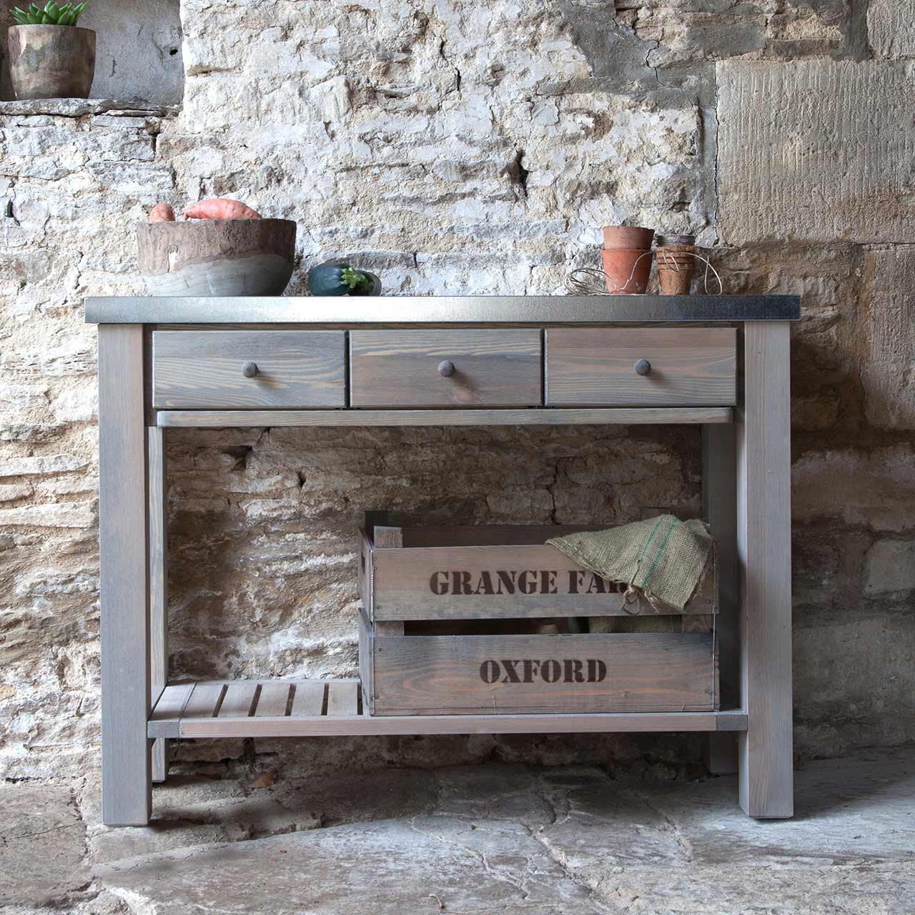 Dieser stabile Gärtnertisch aus Massivholz ist mit drei Schubladen ausgestattet und besitzt eine verzinkte Arbeitsplatte. Diese ist gut zu reinigen und widerstandsfähig gegen Nässe und Schmutz.