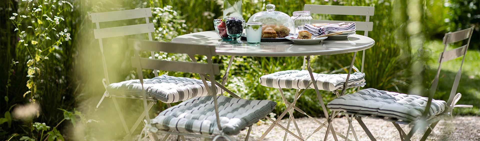 Komfortabel und stilvoll – diese Stuhlkissen sind eine tolle Ergänzung zu unseren Sitzmöbeln aus Metall. Die Stuhlkissen sind in herrlichen Farbkombinationen erhältlich, von neutralen bis hin zu leuchtenden Farben, passend zur Wahl der Bestuhlung und des individuellen Stils. Der Sitzpolsterbezug wird aus 100% Baumwolle gefertigt. Das Innenkissen ist mit Polyfaser gefüllt, die schnell trocknet und stilvoll mit den traditionellen französischen Nähten fixiert ist.Die quadratischen Stuhlkissen in der Größe 40 x 40 cm passen genau auf die Stühle unserer Metall-Sitzmöbel. Natürlich können sie auch für viele andere Außenbestuhlungen genutzt werden. Jedes Sitzkissen hat zwei Bänder zur Befestigung am Möbel. Abmessungen: (L)40 cm x (B)40 cm x (H)3 cm Sitzbezug aus 100% Baumwolle (nicht abnehmbar) Füllung aus Polyfaser Zwei Bänder zur Befestigung am Stuhl Waschbar bis 30 Grad Nicht geeignet für den Trockner