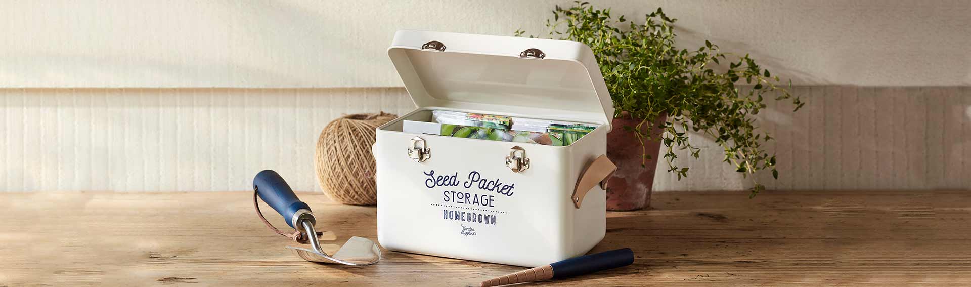 Die praktische Pflanzensamen-Box »Seed Paket Storage« ist das optimale Aufbewahrungsbehältnis für Ihre Pflanzensamen. Sie ist unterteilt in drei Fächer und bietet ausreichend Platz für Samentüten der gebräuchlichsten Größen. Mit den optional erhältlichen 'Samentüten zum Selbstbeschriften' steht dem Start Ihrer eigenen Saatgut-Kollektion nichts mehr im Wege. Breite 27,00 cm, Tiefe 13,00 cm, Höhe 14,50 cm Box aus pulverbeschichtetem Metall Griffe aus Echtleder Lieferung ohne Dekoration