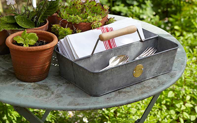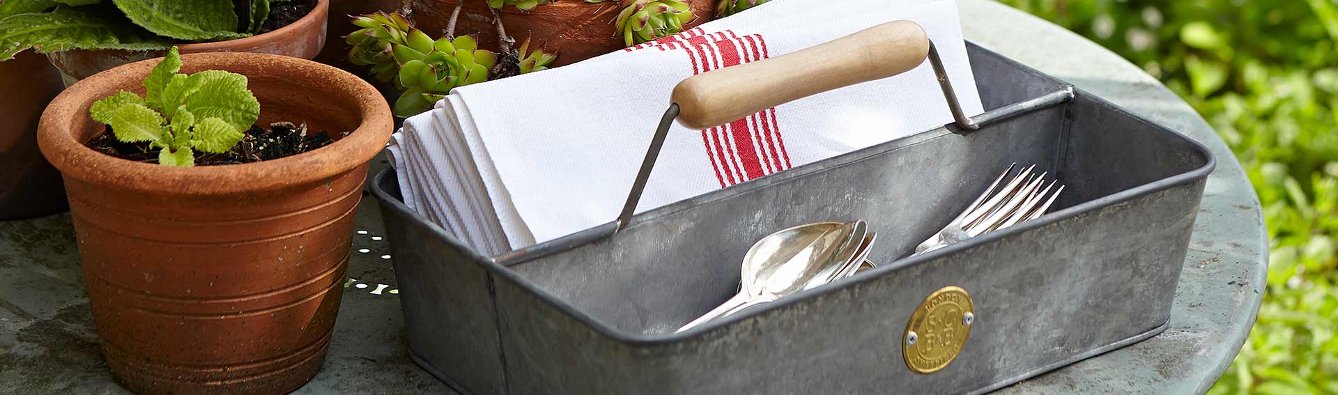 Die attraktive Gartenwerkzeug-Tasche von Sophie Conran ist handlich und leicht, ideal zum Transport Ihrer Lieblingshelfer für den Garten. Handschaufel, Gartenschere, Schnüre & Co. können in der Tasche problemlos verstaut werden und sind nun immer griffbereit.Die Tasche ist aus einem schweren grauen Baumwollstoff im zeitlosen Ticking-Streifendesign gefertigt und mit einer wasserabweisenden PVC-Beschichtung versehen. So bleiben Ihre Gartenwerkzeuge vor Feuchtigkeit geschützt und die Reinigung der Tasche gelingt einfacher. Sophie Conran, aus der bekannten britischen Design-Dynastie Conran, bringt ihren zeitgenössischen Landhausstil in eine breite Palette von Gartengeräten und Accessoires ein. Dieses charmante Gartenaccessoire spiegelt Sophies unverwechselbaren Stil wider - klassisch, aber mit subtilen modernen Designakzenten. Strapazierfähiges, schweres Gewebe aus 100 % Baumwolle Leicht zu reinigen durch wasserabweisende PVC-Beschichtung Mit 'Sophie Conran' Leder-Etikett Breite 30 cm x Tiefe 15 cm x Höhe 20 cm (ohne Trageschlaufen) Gewicht 330g