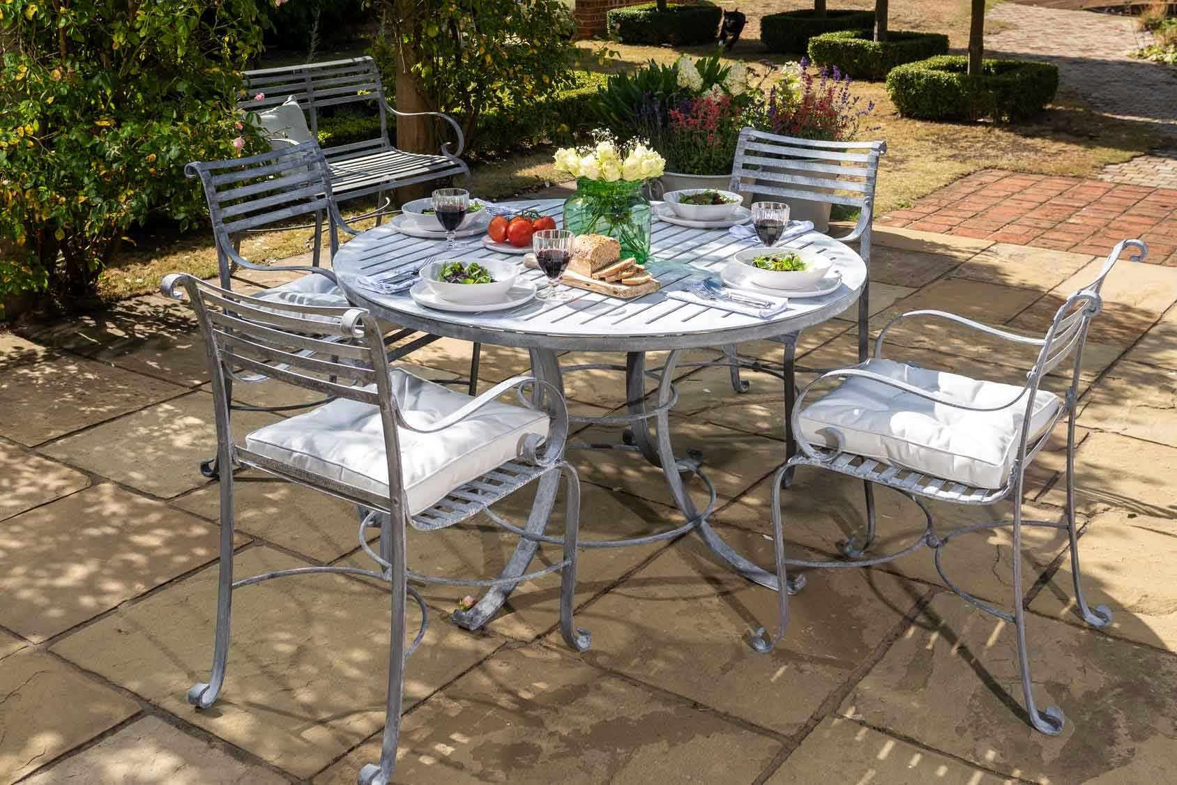 Inspiriert von traditionellen englischen Schmiede-Möbel, haben diese Gartenmöbel einen zeitlosen Reiz und wurden für hohen Sitzkomfort konzipiert. Sie sind Teil der exklusiven Harrod Southwold Gartenmöbel-Kollektion: Handgefertigte Gartenmöbel im traditionellen Stil, hergestellt aus hochwertigem Stahl. Der Stahl wird für eine lange Lebensdauer feuerverzinkt und dann "handgeätzt", um das antike Finish zu erzielen. Aufgrund der handgefertigten Herstellungs- und Veredlungsmethoden sind alle Tische und Stühle Unikate, die im Laufe der Zeit mit der Witterung nur noch besser werden.