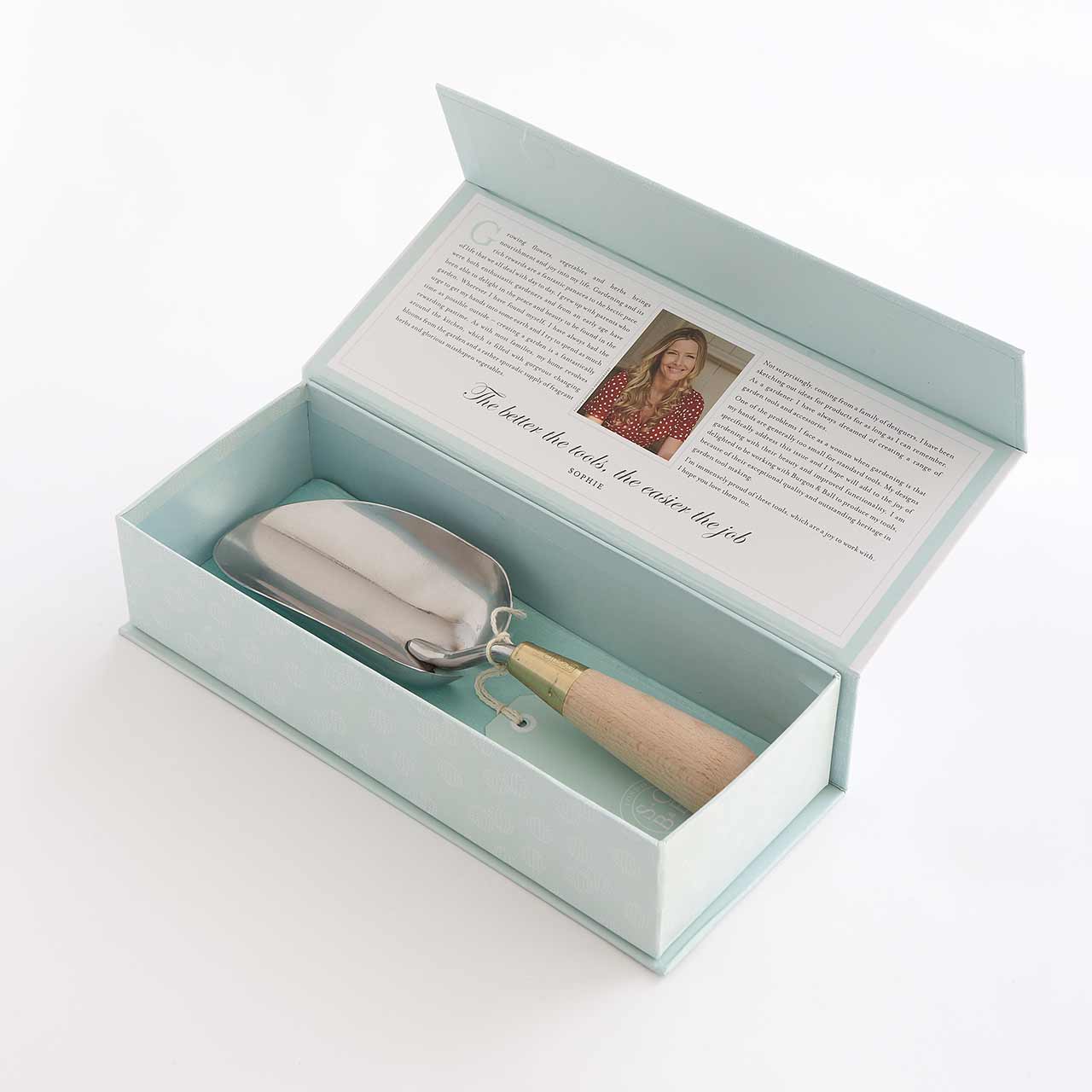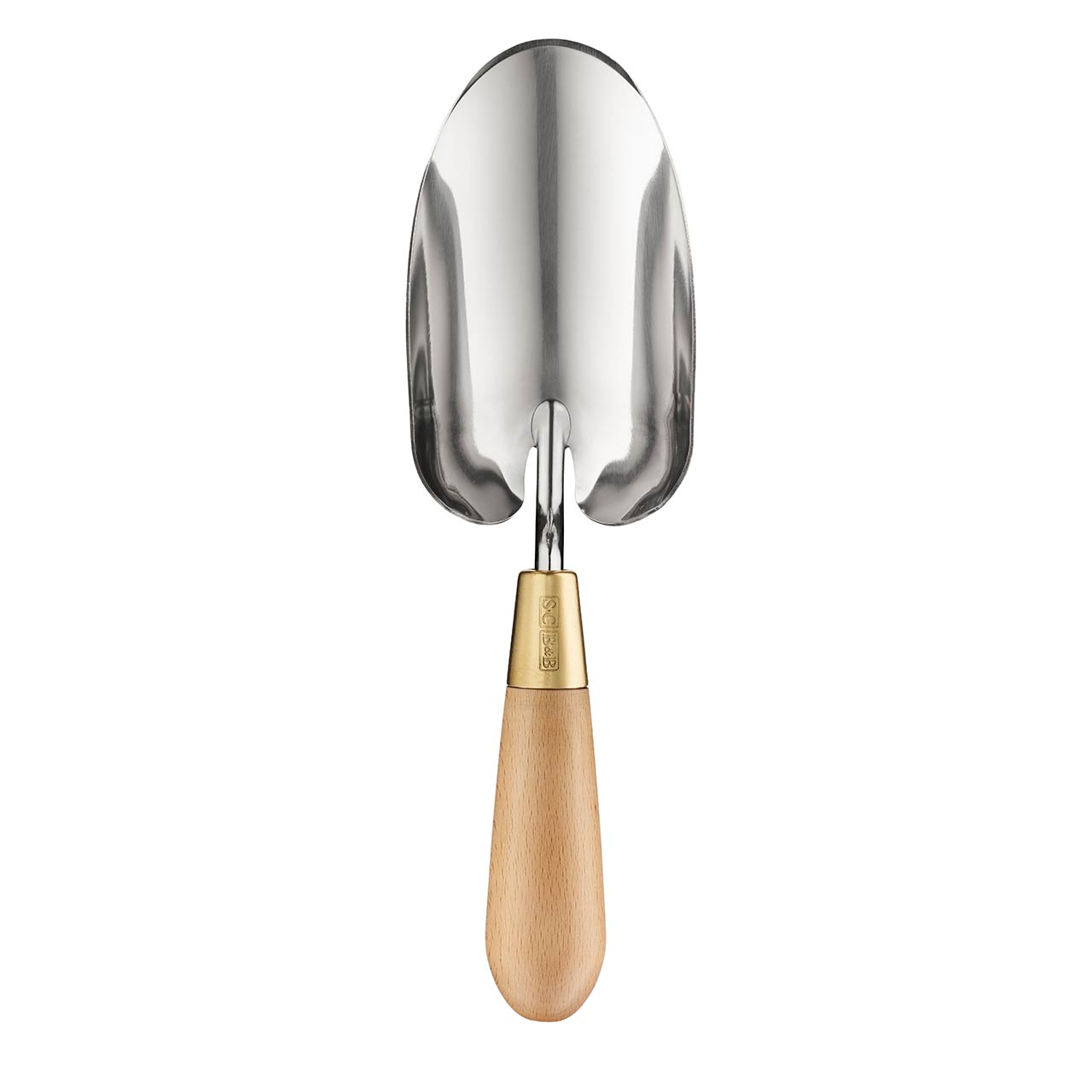 Gutes Design macht ein Produkt funktional. Die Handschaufel von Sophie Conran ist hierfür ein gutes Beispiel. Das großzügige Schaufelblatt ist so geformt, dass wenig Erde beim Grabvorgang herunterfällt. Der Griff aus gewachstem Buchenholz liegt angenehm in der Hand.