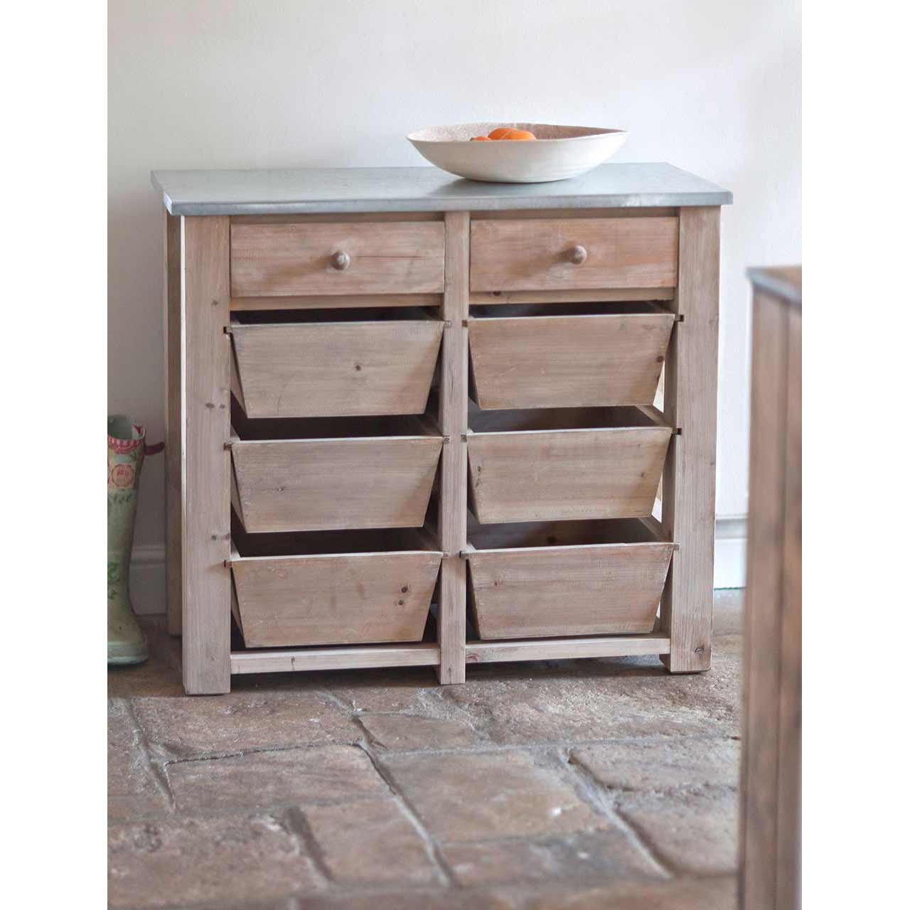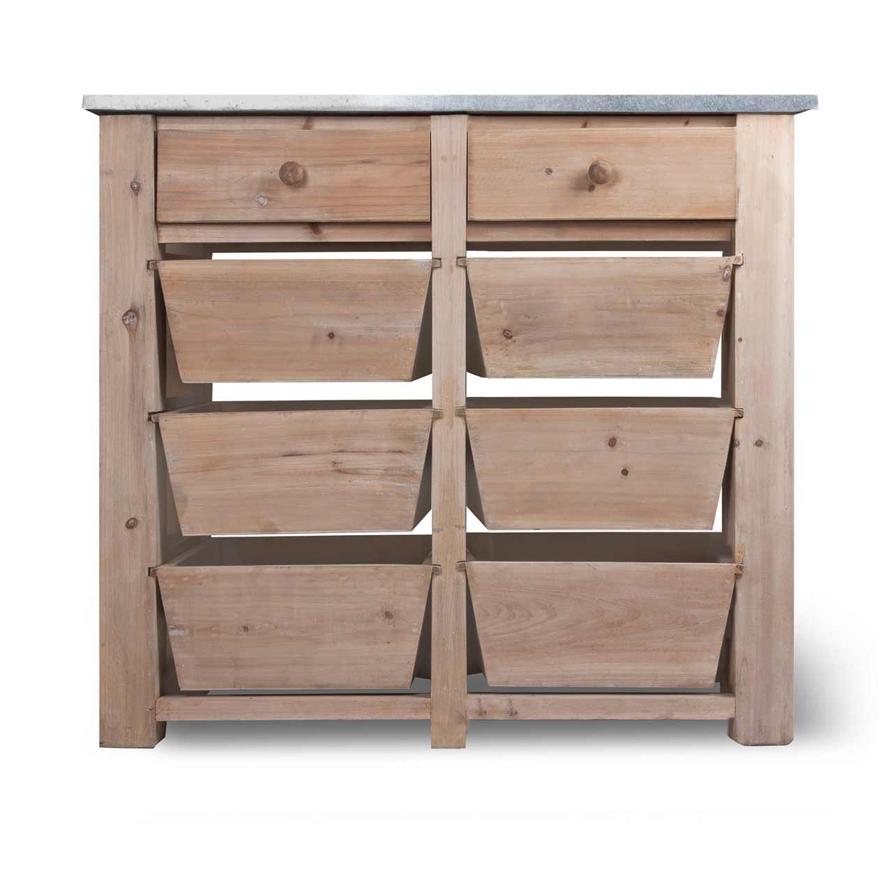 Mit dieser schönen Kommode bringen Sie Ordnung in Ihre Gartenutensilien. Die Kommode besitzt in dieser Ausführung zwei Schubladen, sowie sechs Schubfächer. Die Schubfächer sind alle leicht herausnehmbar und tragbar. So können Sie die gerade benötigten Gartenutensilien mit in den Garten nehmen und sie nach getaner Arbeit wieder übersichtlich in der Kommode lagern. Die verzinkte Arbeitsplatte ist robust und ermöglicht auch kleinere Arbeiten, bei denen Nässe und Schmutz kein Problem sind. Die Kommode sollte allerdings nicht dauerhaft nasser Witterung im Außenbereich ausgesetzt sein. Ihr Platz ist in der Gartenlaube, im Gewächshaus und, durch das klare und zeitlose Design, auch im Wohnbereich.
