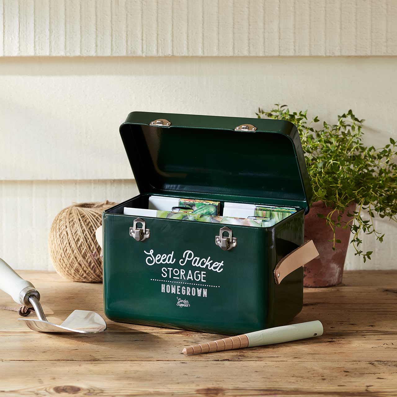 "Für die nächste Aussaat jetzt Samen sammeln, in Samentütchen aufbewahren und in der schicken Box aus Metall mit Ledergriffen verstauen."