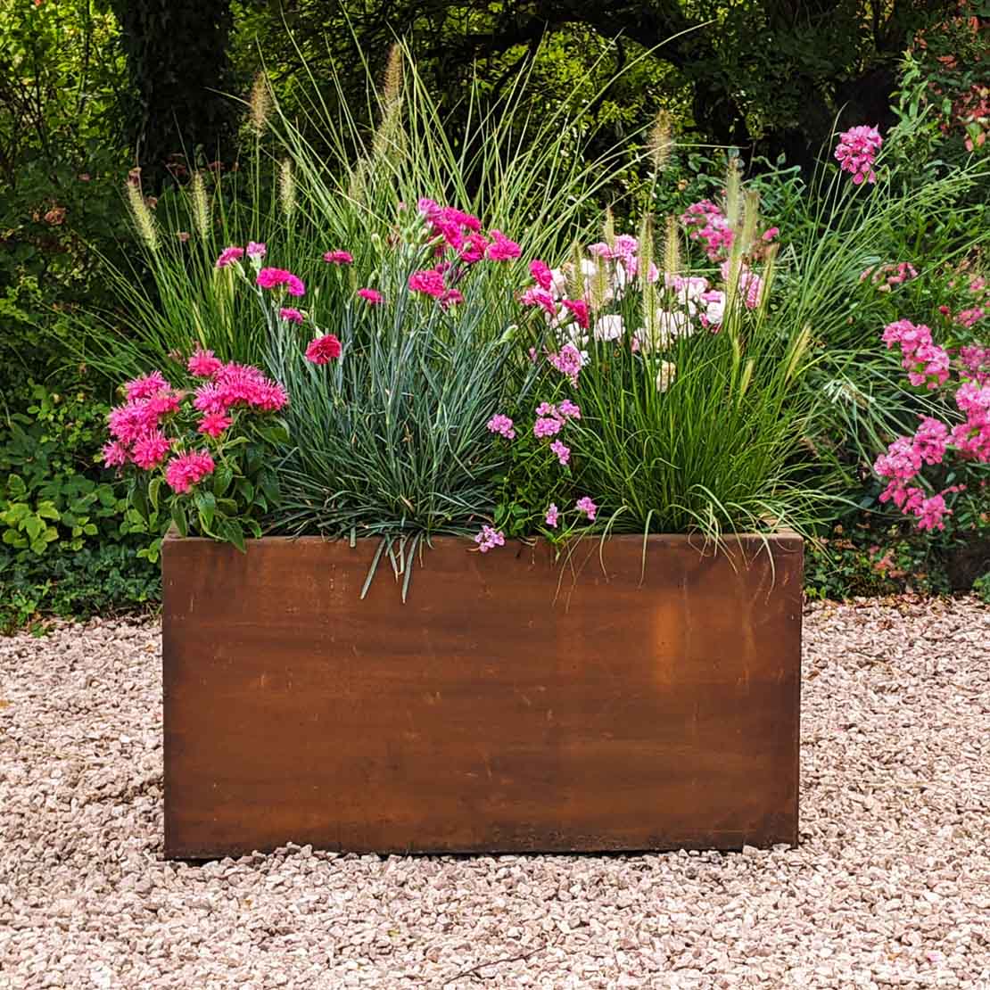 Passend zu den Pflanzkübeln aus der 'King's Cube' Reihe, gibt es jetzt auch den Pflanztrog 'King's Trough' in einer rechteckigen Form. Der 'Kings Trough' ist ebenfalls aus 1,5 mm starkem Stahl hergestellt und besticht durch seine schöne Rostpatina. Er kann im städtischen Umfeld, ebenso wie auf dem Land stehen und ermöglicht durch sein großes Volumen verschiedene Arten der Bepflanzung. Neben Blumen und Gräsern kann er auch mit Beerensträuchern, Rosen oder auch Gemüse bepflanzt werden.