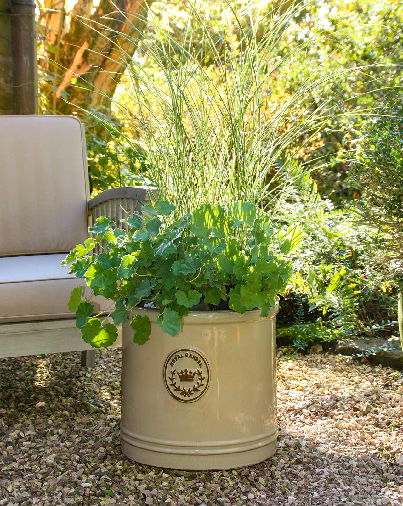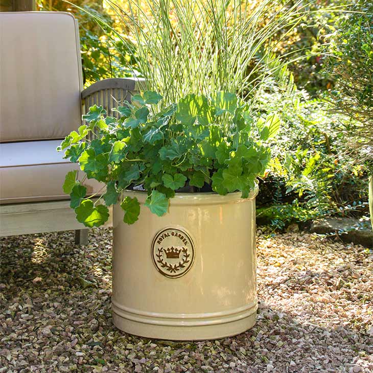 Ein außergewöhnlicher Pflanzkübel mit einem wunderbaren Bandmuster. Mittig deutet das bekannte RHS Emblem auf seine Namensgeber hin. Die Royal Horticultural Society setzt sich für den Erhalt der Gartenkultur in Großbritannien ein und ist Veranstalter, unter anderem, der bekannten Chelsea Flower Show in London. Durch das zeitlose und klassische Design kann der Pflanzkübel in modernen, wie in historischen Gärten seinen Platz finden und bietet mit drei unterschiedlichen Farbtönen und vier verschiedenen Größen eine große Auswahl an Möglichkeiten.Die 'RHS-Pattern' Pflanzkübel werden von Hand hergestellt, daher ist jeder Topf leicht unterschiedlich in Ausführung und Farbe. Dies macht den Charme dieser ganz typischen Pflanztöpfe aus und bringt englischen Landhausflair in Ihren Garten.