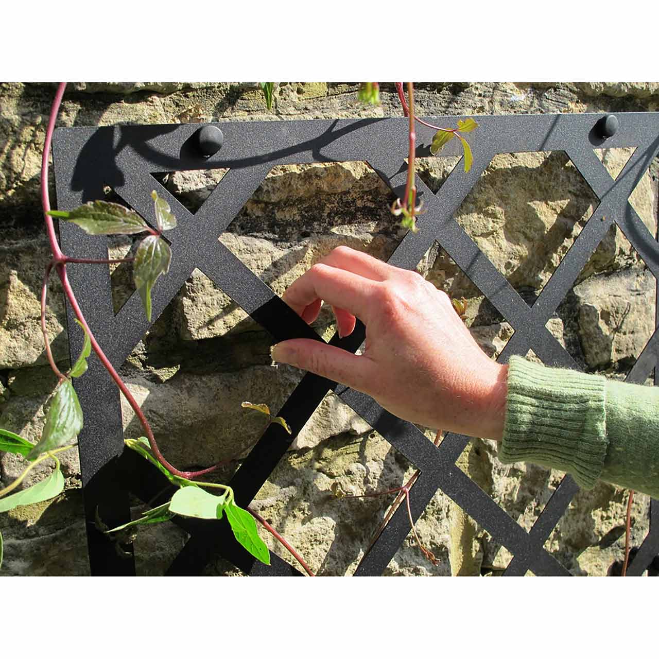 Die Befestigung des Rankgitters geht mit dem beiliegenden Haltematerial einfach von der Hand. Die Fixierschrauben sorgen für einen sicheren Halt und den nötigen Abstand (2,5 cm) von der Wand. Dieser gewährleistet eine ausreichende Luftzirkulation, verhindert Feuchtigkeit an der Wand und ermöglicht den Kletterpflanzen das Gitter zu umranken.