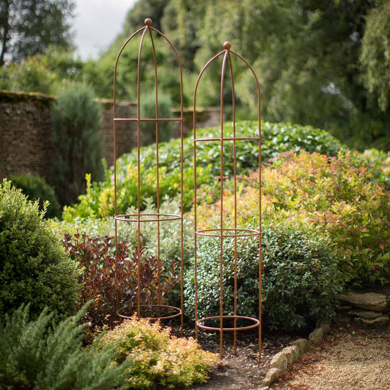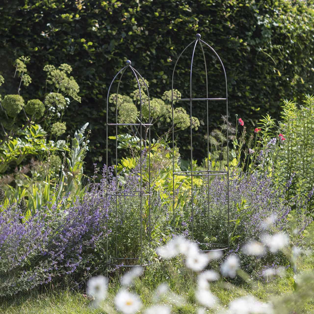 Die Rankobelisken »Large Barrington« sind ein wunderschöner Blickfang in jedem Garten. Mit ihren stattlichen Höhen von 2,0 m und 1,8 m schaffen diese Obelisken reizvolle Perspektiven und Blickpunkte im Gartenbeet oder am Wegesrand. Die gealterte Eisenoptik verströmt von Beginn an den Charme englischer Cottage-Gärten und bringt eine schöne Atmosphäre in Ihren Garten.