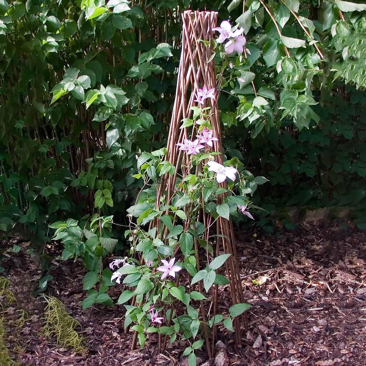 Diese Rankhilfe aus Weidenstäben ist als ausziehbare Weidensäule gefertigt. Kletterpflanzen, wie die kleinwüchsige Clematis oder die einjährige Schwarzäugige Susanne kommen so richtig zur Geltung. Auch im Gemüsegarten ist diese Rankhilfe optimal, zum Beispiel für die Bepflanzung mit einer bunt blühenden Kapuzinerkresse. Der Durchmesser des Fußes kann nach Bedarf variiert werden und passt so als Kletterhilfe auch in viele Töpfe. Zudem kann die Weidensäule zur platzsparenden Lagerung im Winter einfach zusammengezogen werden.
