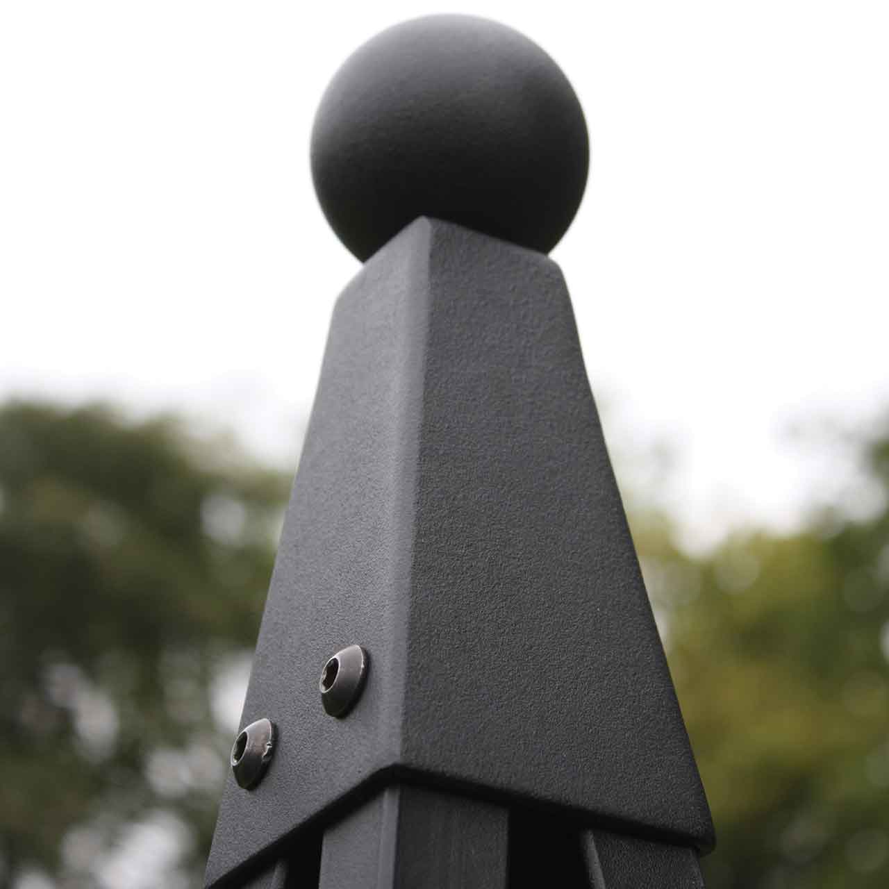 Eine weitere Besonderheit: Durch das Eigengewicht von rund 14 kg und der Stand-Diagonalen von 60 cm am Pyramidenfuß steht die Rankhilfe sehr stabil und muss nicht im Boden verankert werden. So bleibt die beeindruckende Höhe von über 2 Metern in Gänze sichtbar. Da die Verankerung im Boden entfällt, eignet sich diese Rankhilfe auch für die Aufstellung auf festem Untergrund.
