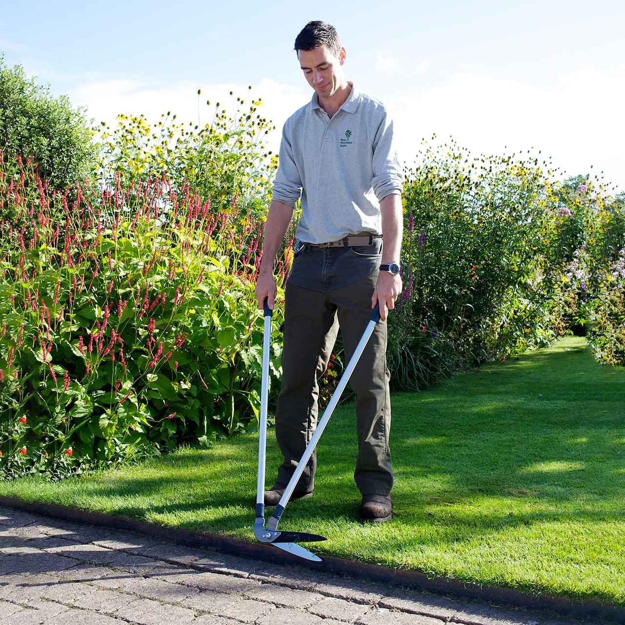Im Gegensatz zu Einhand-Grasscheren kann hier die Arbeit knie- und rückenschonend im Stehen erfolgen. Außerdem entfällt die sich ständig wiederholende Druckbewegung aus Hand und Unterarm. Da die Schnittbewegung auf beide Arme verteilt ist, können so auch längere Beetkanten mühelos geschnitten werden.