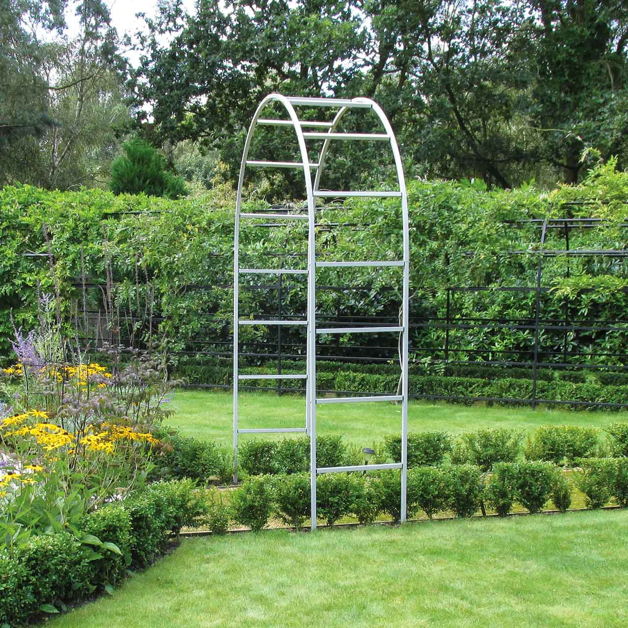 Der Rosenbogen »Roman Silk Grey« von Harrod Horticultural bietet jeder Bepflanzung sicheren und dauerhaften Halt. Das verwendete Vierkantrohr (A) in der Stärke 1,5 mm und dem Kantenmaß von 25 mm ist äußerst stabil. Er wird sorgfältig außen wie innen verzinkt und anschließend mit einer attraktiven Pulverbeschichtung in der Farbvariante 'Silk Grey' versehen. Damit ist das Material extrem witterungsbeständig.