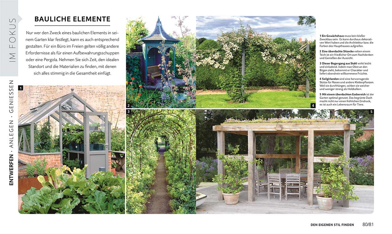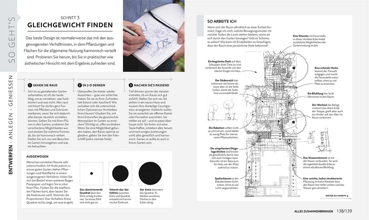 Der innovative Praxisratgeber enthält solides Faktenwissen rund um Gartengestaltung: Leicht verständlichen Anleitungen und detaillierte Fotos und Skizzen liefern in Kombination mit Frage- und Antwortseiten, Checklisten, Planungsskizzen sowie Material-, Werkzeug- und Pflanzenlisten für jedes Projekt alle wichtigen Informationen – sowohl für Gartenanfänger als auch fortgeschrittene Hobbygärtner für das ganz persönliche Gartendesign.