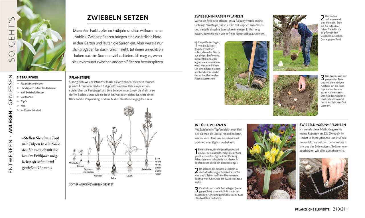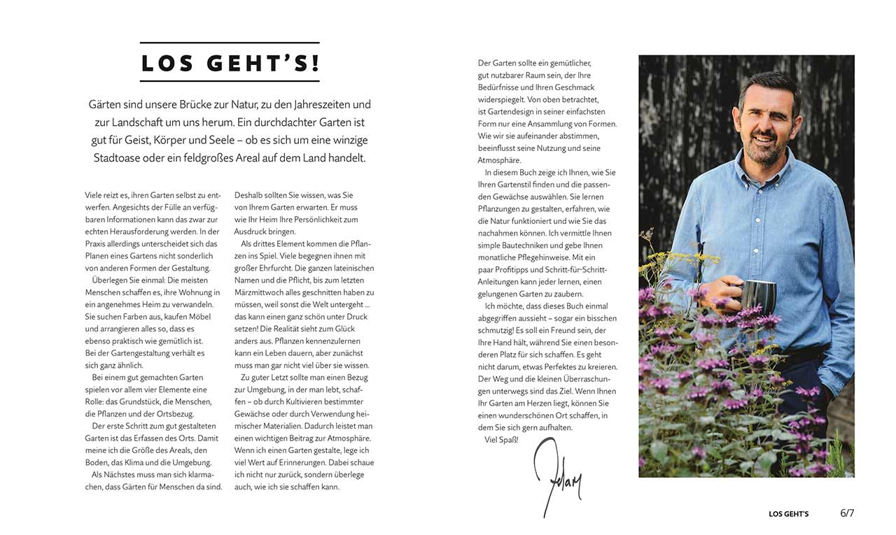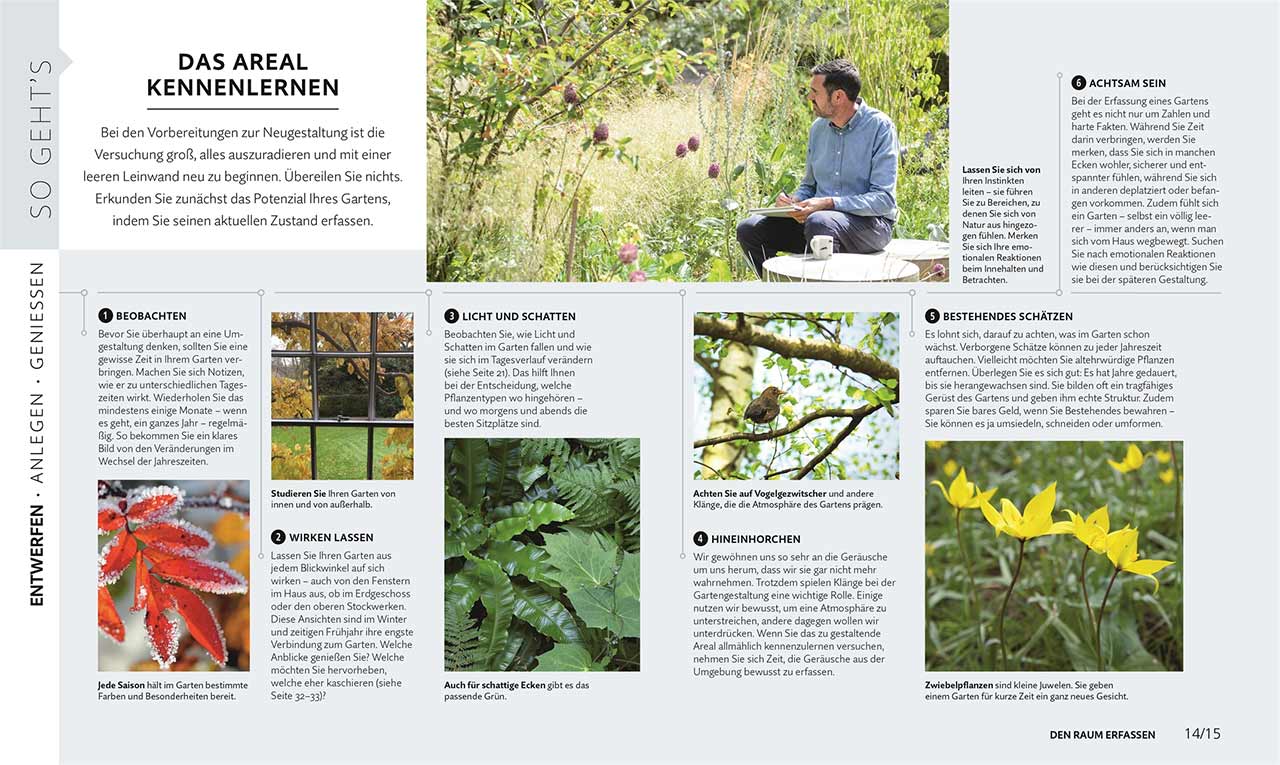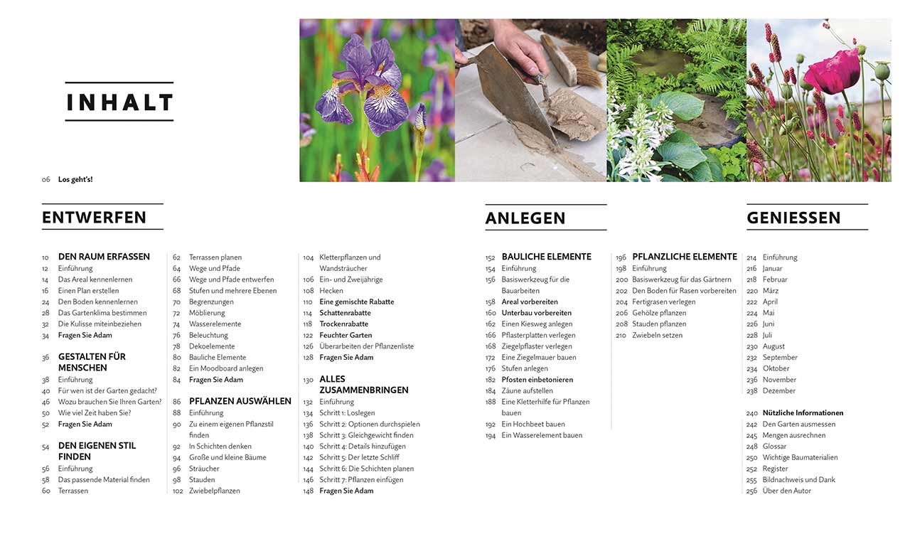 Gegliedert in die drei Hauptkapitel „Entwerfen“, „Anlegen“ und „Genießen“, vermittelt das Buch fundiertes Praxis-Know-How und führt Schritt für Schritt zum eigenen Traumgarten. Zahlreiche Farbfotografien und Gartengestaltungsskizzen ergänzen die übersichtlichen Anleitungen für 16 verschiedene Projekte. Adam Frost zeigt im ersten Kapitel, wie man den Raum erfasst, den Garten dem eigenen Stil passend gestaltet, Pflanzen auswählt und schließlich alles in sieben Schritten zusammenbringt. Anschließend widmet er sich den baulichen und pflanzlichen Elementen: Er stellt Basiswerkzeuge für Bauarbeiten und das Gärtnern vor, gibt praktische Tipps zum Kiesweg anlegen oder Stauden pflanzen. Kompakte Pflanzenporträts liefern wichtige Informationen, u.a. über den besten Pflanzort. Das letzte Kapitel zur Planung des Gartenjahrs vervollständigt das Buch: Je eine Doppelseite führt die wichtigsten Aufgaben pro Monat auf.