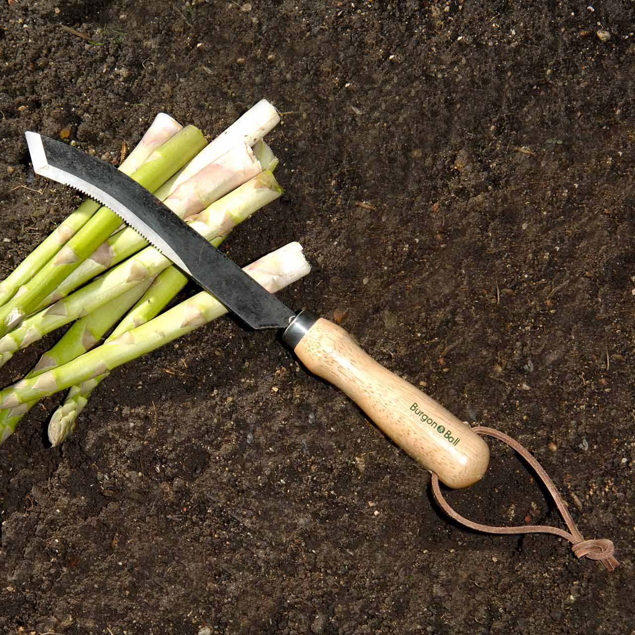 Dieses Spargelernte-Messer von Burgon & Ball ist ein einzigartiges Werkzeug. Es kombiniert die beiden beliebtesten Methoden zum Anbau bzw. zum Ernten von Spargel: Einmal besitzt das Erntemesser eine geschärfte Spitze zum Ernten ("Stechen") von Bleichspargel. Hier wird jede Spargel-Stange vorsichtig so tief als möglich freigelegt und kurz oberhalb der Wurzelkrone "gestochen".