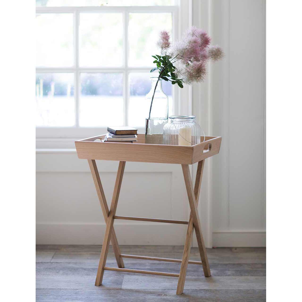 Zum Zusammenklappen viel zu schade! Der Tabletttisch »Winson« bietet Abstellgelegenheit für viele schöne Dinge. Der neue Lieblingsplatz für den Tee am Nachmittag kann kurzerhand auf die Terrasse oder ein gemütliches Plätzchen im Garten verlegt werden. Er trägt die überschüssigen Gläser bei der Geburtstagsfeier, die Lampe im Flur, die Möglichkeiten sind vielfältig. Das Tablett ist abnehmbar und kann auch separat genutzt werden. Sollte der Tabletttisch doch einmal im Wege stehen, kann er platzsparend zusammengeklappt auf seinen nächsten Einsatz warten. Das Eichenholz wurde leicht geölt, um die natürliche Maserung des Holzes zu betonen und die Oberfläche zu schützen.